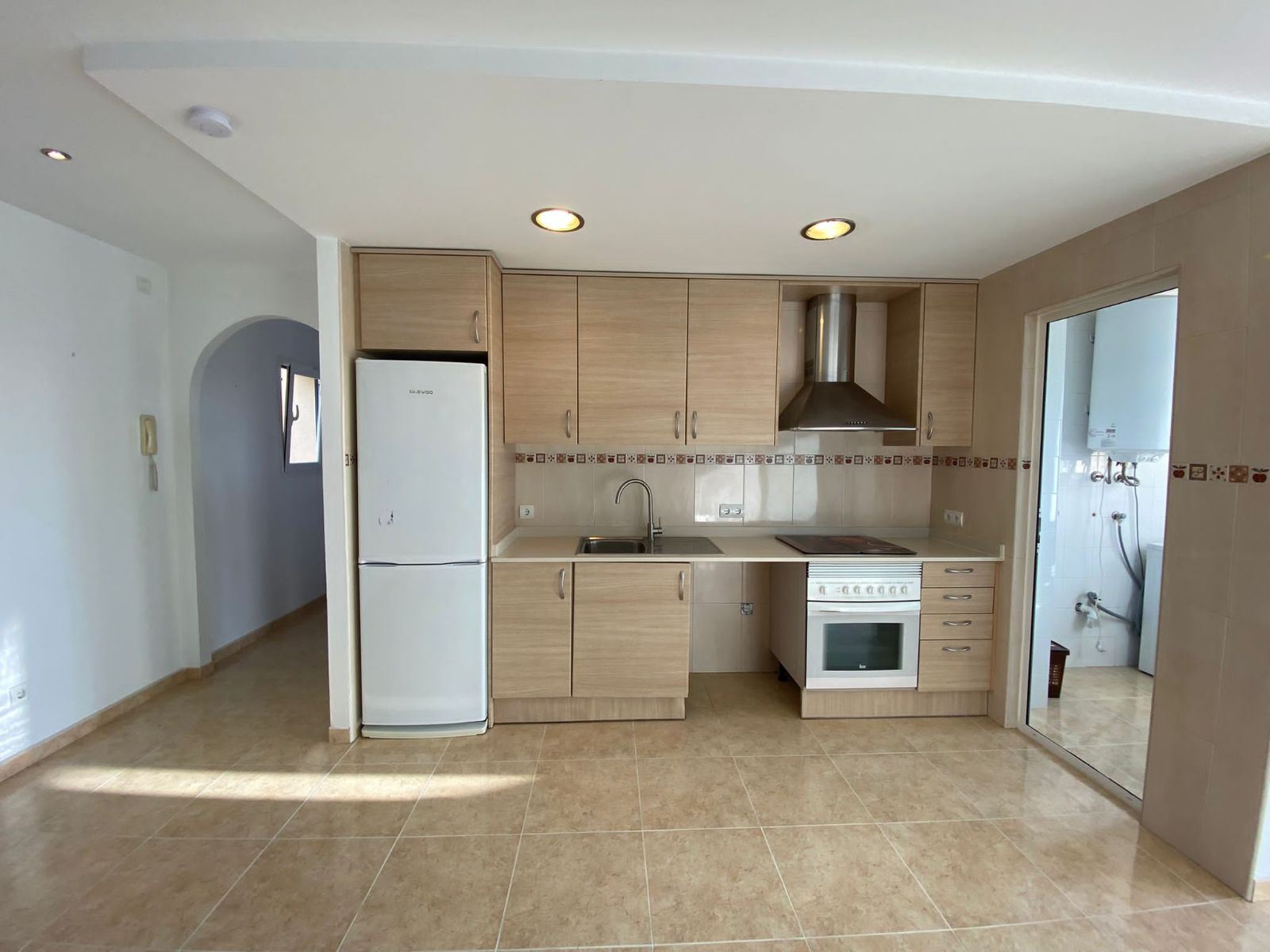- Amplio salón comedor con cocina integrada (amueblada y equipada) con acceso tanto a la coladuría como a terracita con vistas despejadas sobre el pueblo.